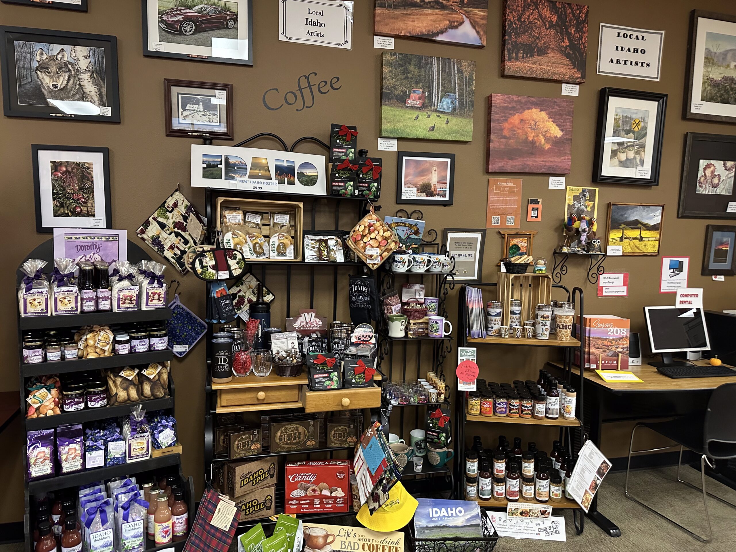 Stop in at the coffee counter for a snack and locally roasted coffee by Dawson Taylor Coffee Roasters. Get it to go or relax at one of our tables. Browse the wall-to-wall shop of gifts including a large collection of Idaho products.